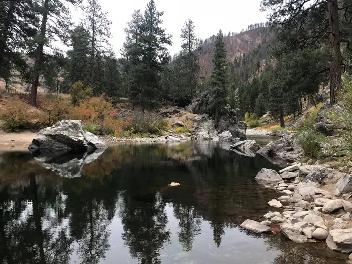 Nestled in Idaho's beautiful Sawtooth National Forest, Baumgartner Hot Springs offers a warm, inviting retreat where natural hot water meets comfortable amenities. The large concrete pool holds water heated to a soothing 111°F, creating a calm spot to relax surrounded by towering pines and mountain air.