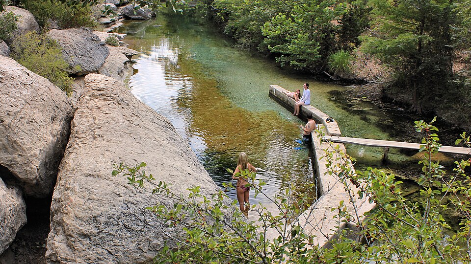 Jacob’s Well is a striking cold spring in Texas that draws nature lovers to its crystal-clear, 68°F waters. This karstic spring marks the entrance to one of the longest underwater caves in the state, forming the headwaters of Cypress Creek. Its dynamic blend of serene swimming holes and mysterious caverns offers a unique experience among hot springs in Texas.