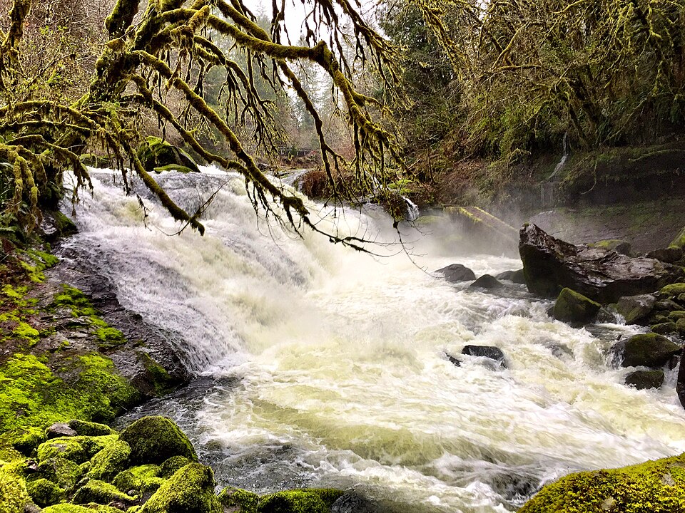 Access to Lake Creek Falls involves a moderate 15-minute walk from a small, limited parking area near the Lake Creek Falls trail, located about two miles past Triangle Lake County Park on Route 36. You cross the street to reach the trailhead, then follow the path and descend a set of stairs before arriving at the falls area.